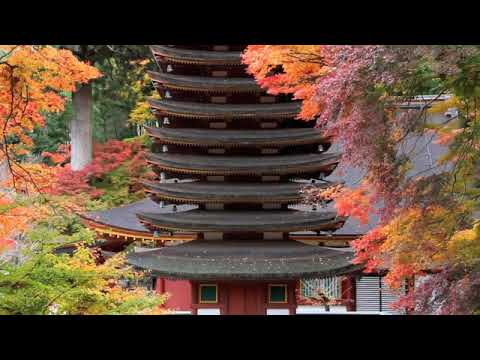 塔の檜皮(ひわだ)葺きの黒っぽい渋い茶、塗り壁の白、柱や軒下の垂木などの赤に、樹々の葉の緑・赤・黄が点描のような濃淡を示しながら彩りを添える。風にふかれて揺れる、樹々の葉が優美である。